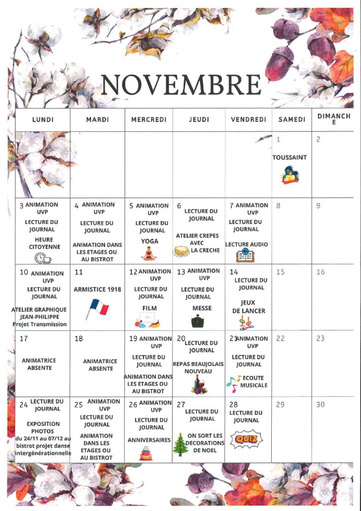 Planning des animations du mois de novembre par Yvana - Clara Animatrices | 29 Oct 2025 | Animations, Programmes d'activités